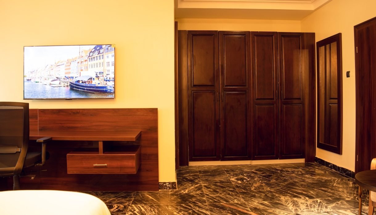 Elegant room with a king-sized, ideal for business travelers or couples. Room includes an extended space and balcony for guests.